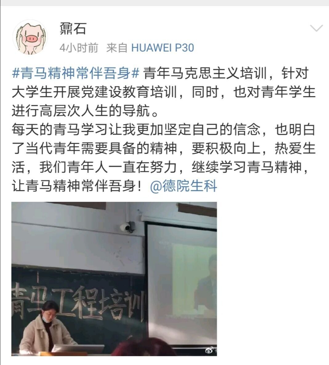 以青年马克思主义培训工作为契机,为进一步引导青马班学院树立积极践行社会主义核心价值观的理念,2020年12月1日至12日期间,ok138电子官方网站青马班学员借助微博平台发起以“青马精神常伴吾身”为主题的微博互动活动。