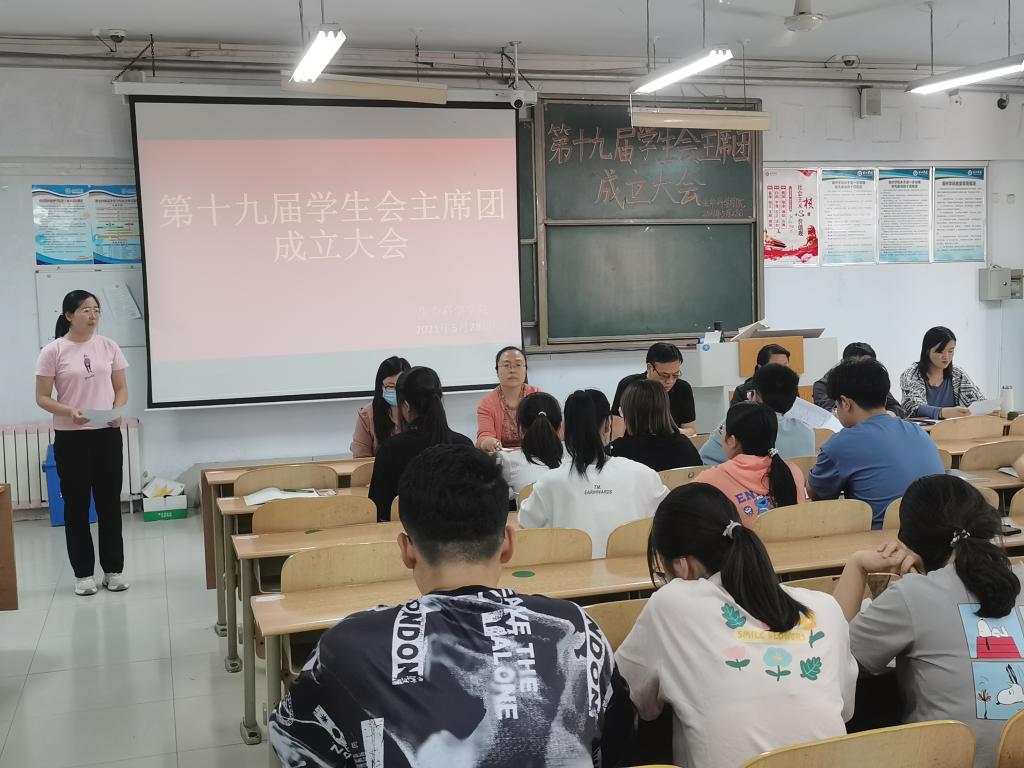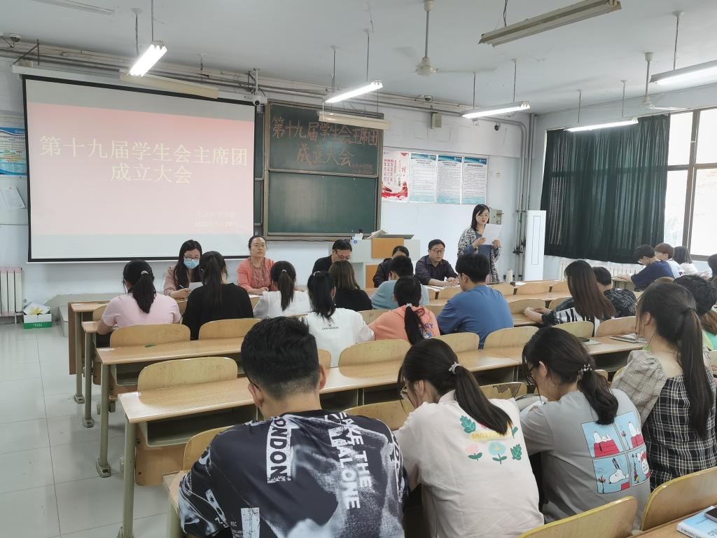 会议伊始,孙珍辉老师宣读第十九届学生会主席团成员名单及具体分工。通过学生本人竞选演讲、学生工作小组考察,王小君当选为第十九届学生会主席,王素丽、唐慧敏、陈雯琪、张学正当选学生会副主席。