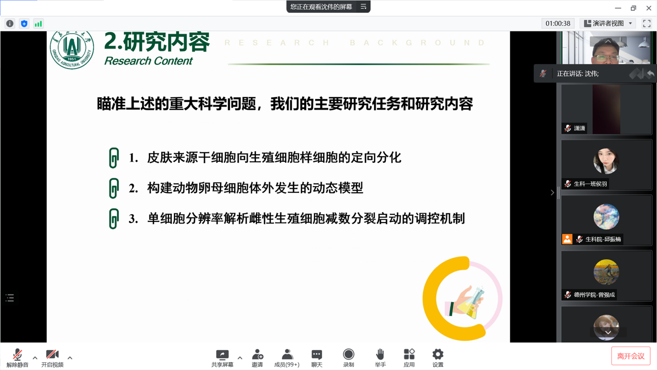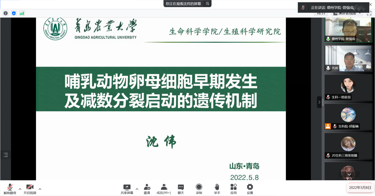 2022年5月8日,ok138电子官方网站、现代生物技术产业学院、生物物理研究院、科研处通过腾讯会议联合开展了ok138电子官方网站51周年校庆学术讲坛—哺乳动物卵母细胞早期发生及减数分裂启动的遗传机制。青岛农业大学ok138电子官方网站院长沈伟为大家作了专题学术报告,我院院长、专业课老师及20级部分学生参加了此次活动。