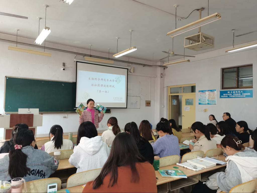 测试工作中,各组师范生注重教学情境设计,合理运用启发式、探究式等教学方法,深入浅出地讲解知识要点,阐释科学道理,拓展知识的深度与宽度。同时,师范生们富有激情的语言、端庄大方的教态和优美的板书,也彰显出他们扎实的教学功底。最后,学院教师进行点评,从各个方面为师范生们提供了专业的指导和建议。