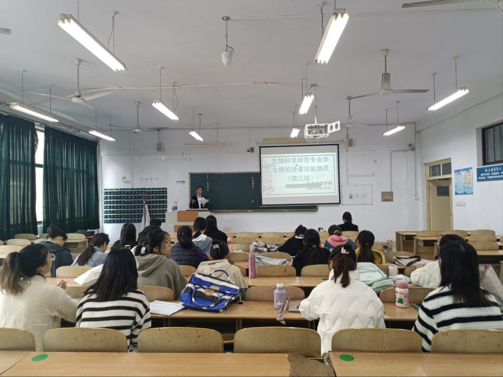 10月8日,我院2019级生物科学专业师范生分成五组进行模拟授课技能测试工作。学院领导班子成员、生物科学专业系主任、生物学科教学专业教师、新引进青年博士教师进行现场观摩指导。