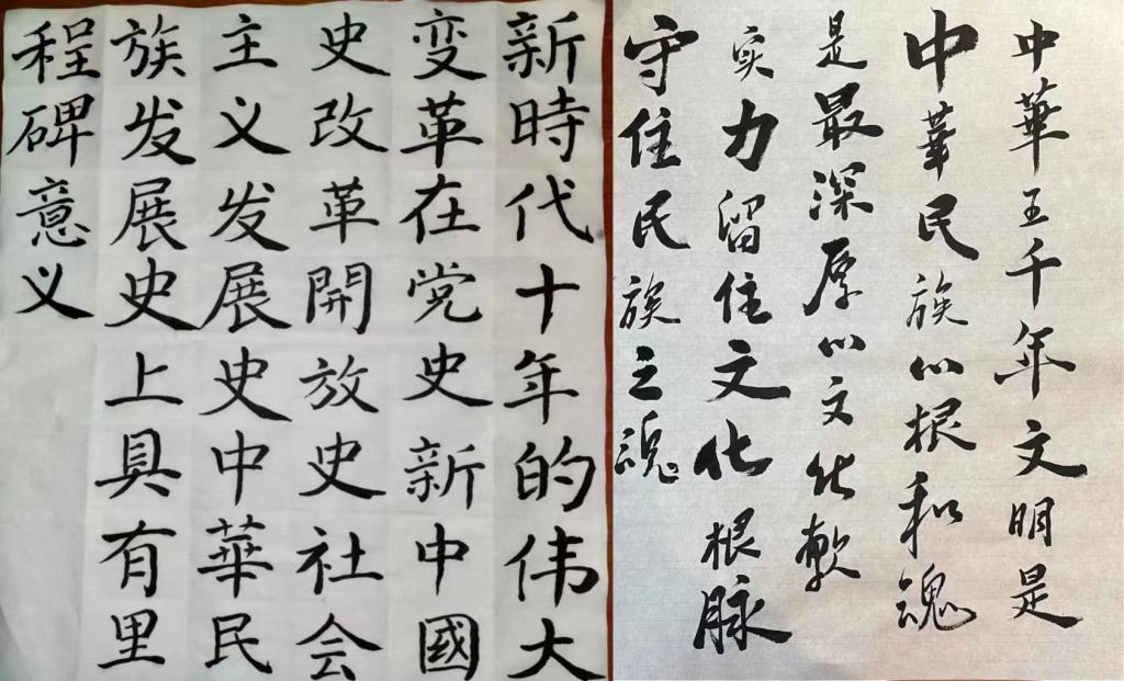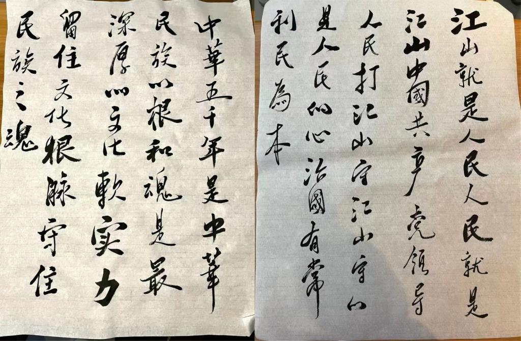 活动中,同学们学金句、读金句、悟金句,用饱蘸真情的笔墨,精湛的笔法,各具特色的书体,选取党的二十大报告中的金句,创作成书法作品,通过一撇一捺书写盛世芳华,一笔一划传达金句内涵,展现出新时代青年关心国家大事,在新征程中踔厉奋发,勇毅前行的决心。