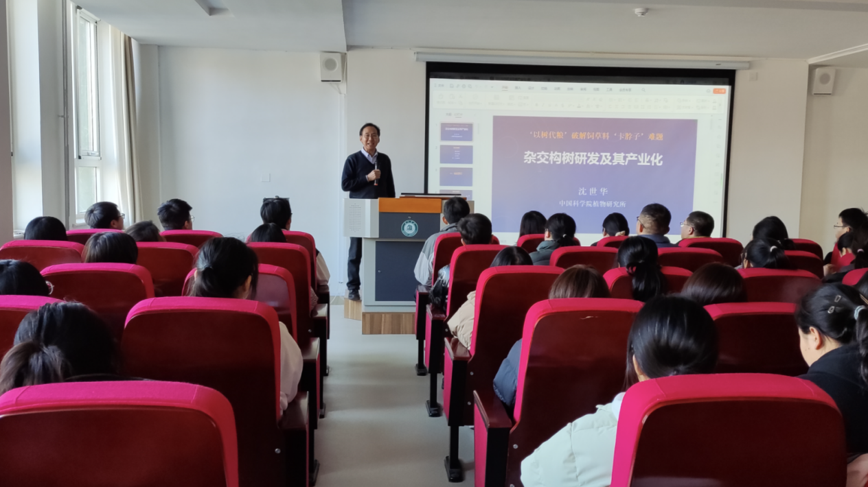 沈世华研究员围绕“杂交构树研发与应用”这一主题,从杂交构树的分子育种和推广应用两个方面进行介绍,深入浅出、通俗易懂的阐述了杂交构树的研究成果。针对我国蛋白饲草紧缺等国家重大需求和高蛋白质饲草料‘卡脖子’难题,沈世华课题组培育出第一个木本、高蛋白、多功能型饲用杂交构树新品种,并提出杂交构树‘以树代粮、种养循环’的思路,构建了‘构-饲-畜’一体化生态农牧业技术体系,为我国饲草料供应和乡村振兴产业提供了重要资源。随后,沈老师毫无保留地就课题申报的注意事项做了深入浅出、具体详实的讲授,既有理论高度,又有他多年参与科研课题评审的丰厚经验分享,同时建议老师们将日常教学内容与科研方向相结合,专注自己研究的领域,保持科研的连贯性。