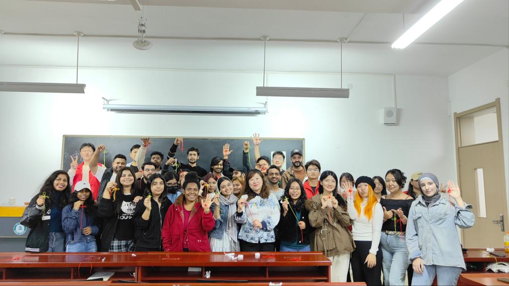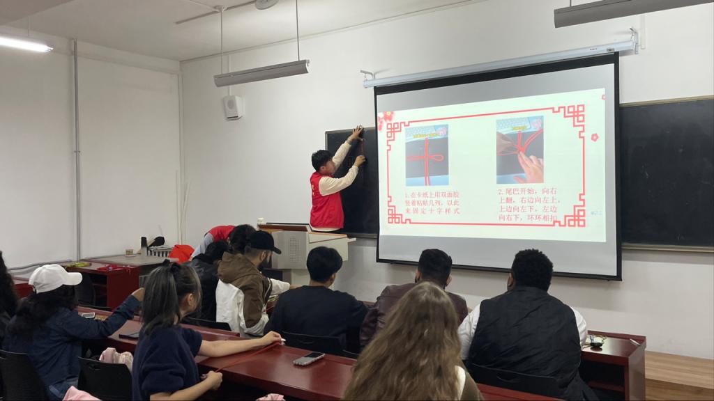 活动开始,志愿者们通过PPT生动展示了中国结的历史、文化内涵及编织技巧,精美的图片和生动的文字激发了外国留学生们的浓厚兴趣。随后,进入互动教学环节,志愿者们一对一指导留学生编织中国结,从基础绕线、打结到复杂图案,耐心传授每一个步骤。大家学得十分认真,不时提问,现场气氛活跃。在志愿者的悉心指导下,一个个精美的中国结在留学生手中诞生,他们脸上洋溢着满足和喜悦的笑容。这些中国结不仅寓意吉祥,更承载了中外友谊的深厚情谊。