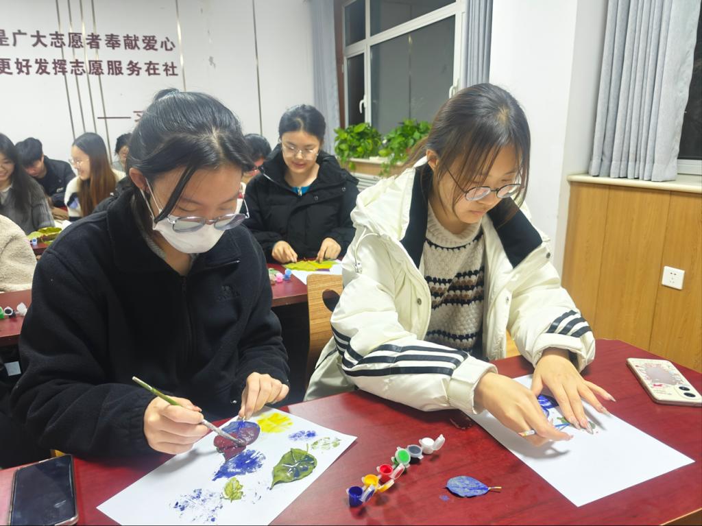活动伊始,社团部成员顾雯作为主讲人登台,以饱满热情的态度和诙谐幽默的表达,将植物拓印的细节及流程逐一拆解,深入阐述其蕴含的独特意义,把同学们引入了一个妙趣横生的植物世界,让大家对植物拓印有了全新且深入的感知。紧接着,志愿者把各类植物树叶和绘画工具有序分发给同学们。大家凭借刚汲取的植物拓印知识,将树叶平铺在纸上,用颜料和画笔精心涂抹着,一幅幅精美的画作跃然纸上。