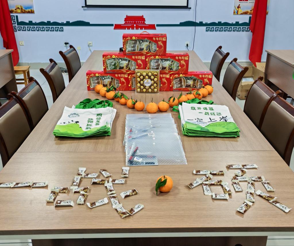 学院精心准备的关怀礼包满载心意,其中有印着院徽、院训与‘一定上岸’祝愿的特制帆布包,传递着殷切期许,还有象征一战‘橙’硕的橙子、寓意‘巧克’难关的巧克力以及金榜题名文具套装,尽显学院对考研学子的关怀与期待。