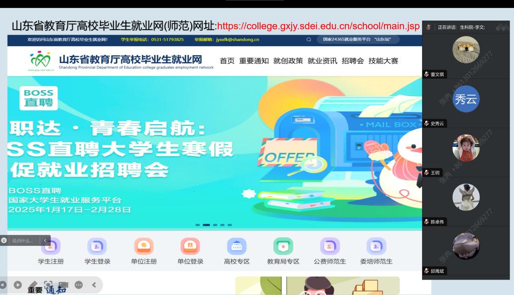 会议伊始,辅导员孙珍辉老师分析了当下的就业形势,讲述了西部计划的相关内容,包括优惠政策、就业途径等。此外,会议还提到了征兵的优惠政策,如学费补偿、免试考研等,强调了关注相关公众号的重要性,以便及时获取就业信息和企业招聘信息。我院创业就业部负责人详细讲解了如何登录山东省教育厅高校毕业生就业网,填写个人信息、上传证明材料等步骤,针对不同就业类型,包括升学、灵活就业、网签、劳动合同等的录入相关事宜进行重点解读。