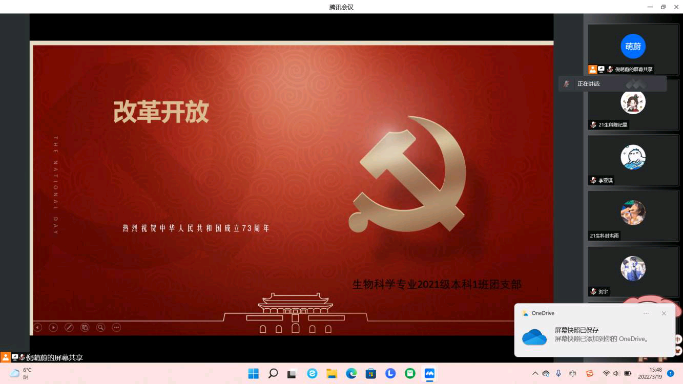 为了加强同学们对党史的学习,深入了解中国共产党的发展历程,2022年3月10日,ok138电子官方网站生物科学专业2021级本科1班团支部组织同学们线上开展改革开放党史学习会。
