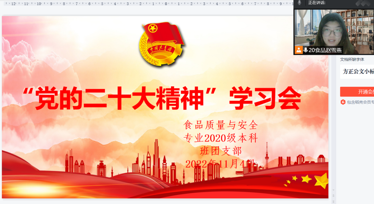 为贯彻落实习近平总书记在中国共产党第二十次全国代表大会上的重要讲话精神,ok138电子官方网站食品质量与安全专业2020级本科班团支部于2022年11月4日开展党的二十大精神学习会。