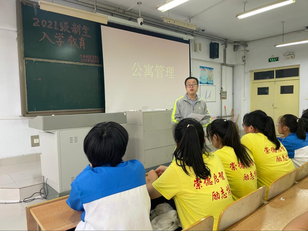 团总支书记王艳洁就共青团工作进行讲解,重点给新生们介绍了学生入团、团员推优流程、团组织发展,社团概况、学生会组织等。尤其是在学生会队伍建设方面,从如何选人、如何用人和如何培养人方面作了详细解读,并鼓励同学们积极加入学生会队伍;周老师详细解读了校级、院级等公寓管理相关条例,遵守校规校纪,提高自身安全意识,杜绝使用大功率电器。同时,他还带领大家学习《公寓管理中心维修管理办法》,叮嘱同学们在日常生活中够保护好公寓财物,有问题及时上报维修管理人员。孙老师为大家介绍了宣传、易班等工作,在网络思想政治教育方面,提醒同学们注意网络言论,避免网络舆情;郑老师为同学们详细介绍了大学生入伍政策,并鼓励大家积极参军入伍,为国效力。