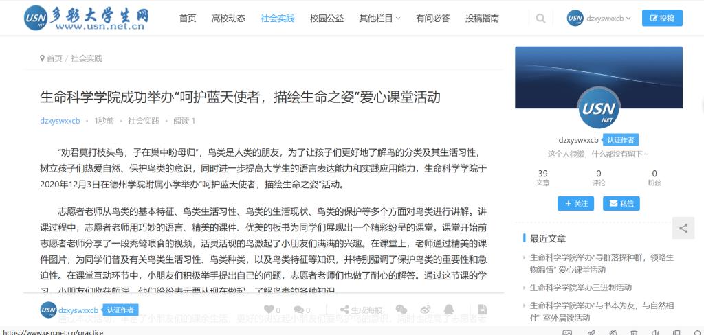 “劝君莫打枝头鸟,子在巢中盼母归”,鸟类是人类的朋友,为了让孩子们更好地了解鸟的分类及其生活习性,树立孩子们热爱自然、保护鸟类的意识,同时进一步提高大学生的语言表达能力和实践应用能力,ok138电子官方网站于2020年12月3日在ok138电子官方网站附属小学举办“呵护蓝天使者,描绘生命之姿”活动。