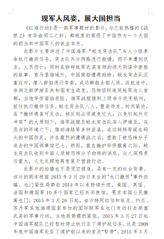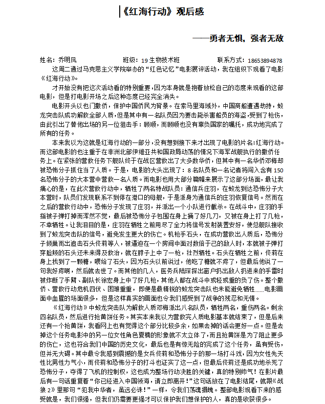 活动期间,同学们观看了《八佰》《红海行动》《空天猎》三部弘扬时代主旋律的优秀电影作品。影片放映开始前同学们便按耐不住焦急的心情早已在教室等待。观影过程中,同学们聚精会神,沉浸于历史长河中去找寻自己内心深处与祖国的情感共鸣。播放至高潮时,同学们潸然泪下。人肉炸弹不怕牺牲、视死如归的精神,蛟龙队员孤军奋战、不畏强暴的英勇,无不催人泪下,引起同学们共鸣。放映结束,全场迸发出雷鸣般的掌声。活动现场气氛融洽,秩序井然,离场时每人都还回味无穷。“骄傲”“感动”“震撼”......怀着无比激动的心情,同学们用笔尖书写下自己的真情实感。活动最后,经过评委打分以及令人紧张的网络评选后,ok138电子官方网站乔明凤、林贵凯、徐硕淇同学分别取得了一等奖、二等奖、三等奖的优异成绩。