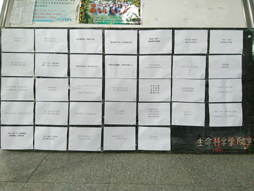 同学们积极参与这次标语活动,作品上交的非常及时。作品原创新颖,又不失内涵,充分表现出了文明用餐的活动理念。作品贴于展板之后,在求实楼公示处展出。过往的同学们都停下脚步,观看并深入理解这些标语,足以看出此次活动的理念渐入人心。