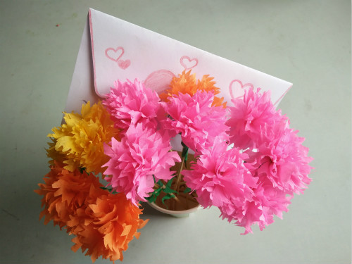 此次活动要求同学们亲手制作康乃馨纸花,并附上写着祝福语的贺卡。一朵朵康乃馨,如有生命般鲜活艳丽,歌颂着同学们对母亲的感激。一张张贺卡,绘制精美,赏心悦目,传达的是对母亲最真挚的祝福。一声声祝愿,诚挚美好,真诚衷心,透露着对母亲不尽的感激与敬仰。