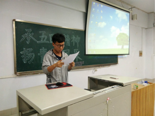 此次活动,由该班级参加活动的同学以宿舍为单位上台进行PPT演示,讲解自己心中的五四精神。活动期间,同学们通过声情并茂的讲话,结合PPT精美的图片,为同学们讲解了五四运动的爆发、五四青年节的由来,并就五四精神讲出了自己的见解。