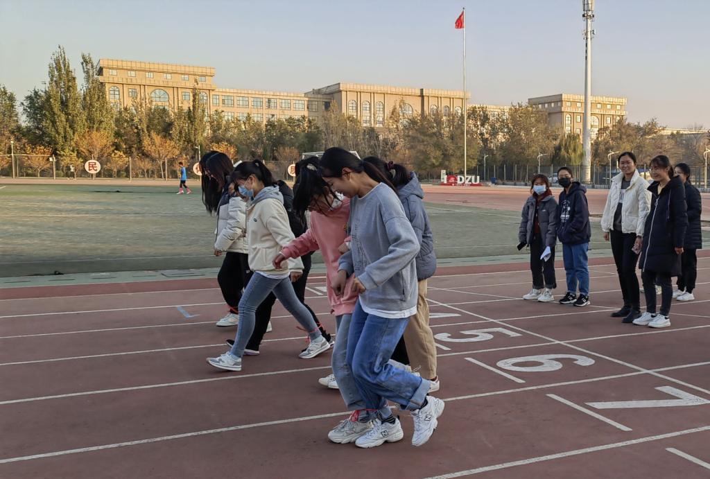 活动开始前,同学们有序的进入比赛场地,一边讨论比赛技巧,一边进行热身。活动正式开始,同学们两两一组并排站立,用绳子将脚踝捆绑在一起,整装待发。随着裁判员的一声令下,同学们并驾前驱,步调一致,配合默契,目光坚定直奔终点。在观众的欢呼声中,四组选手依次冲过终点,最终决出高低。