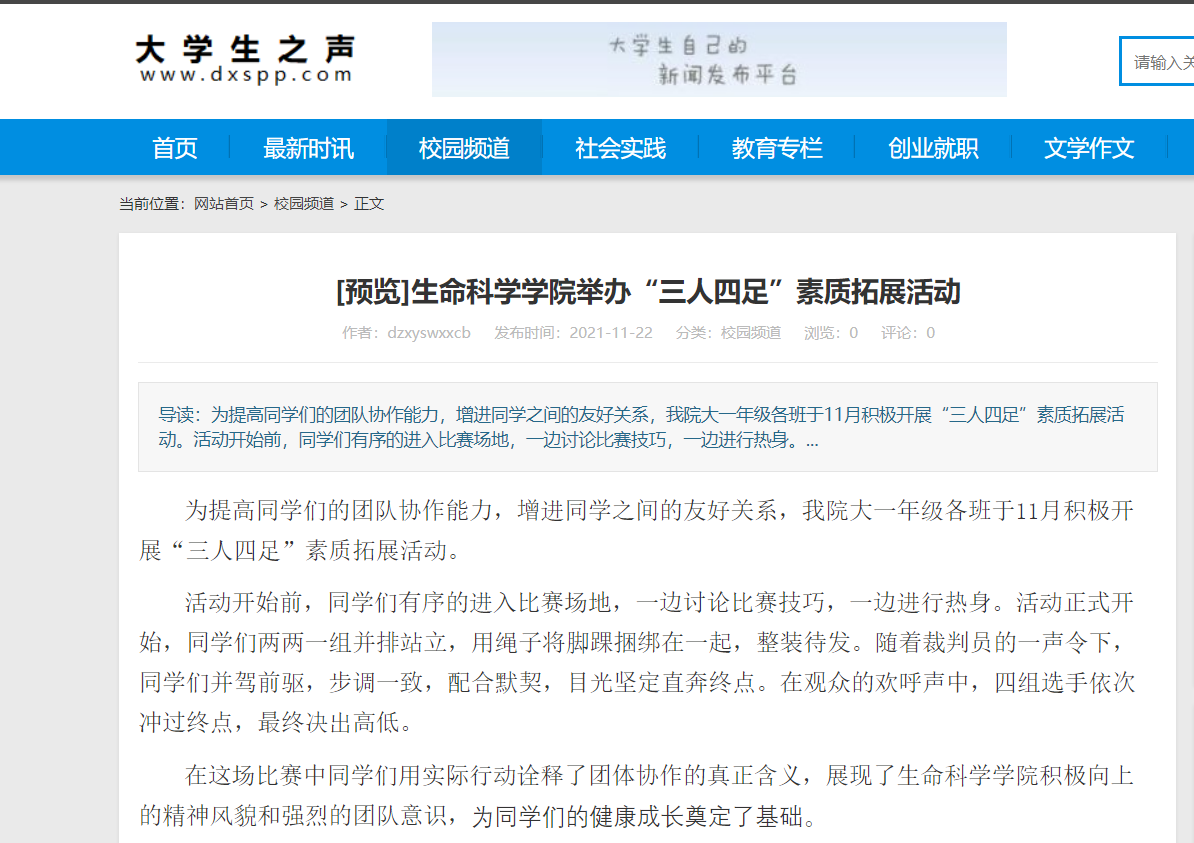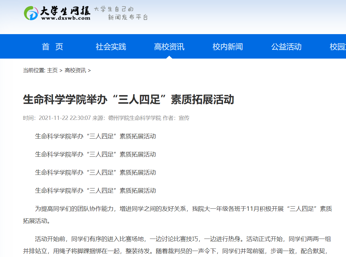 为提高同学们的团队协作能力,增进同学之间的友好关系,我院大一年级各班于11月积极开展“三人四足”素质拓展活动。