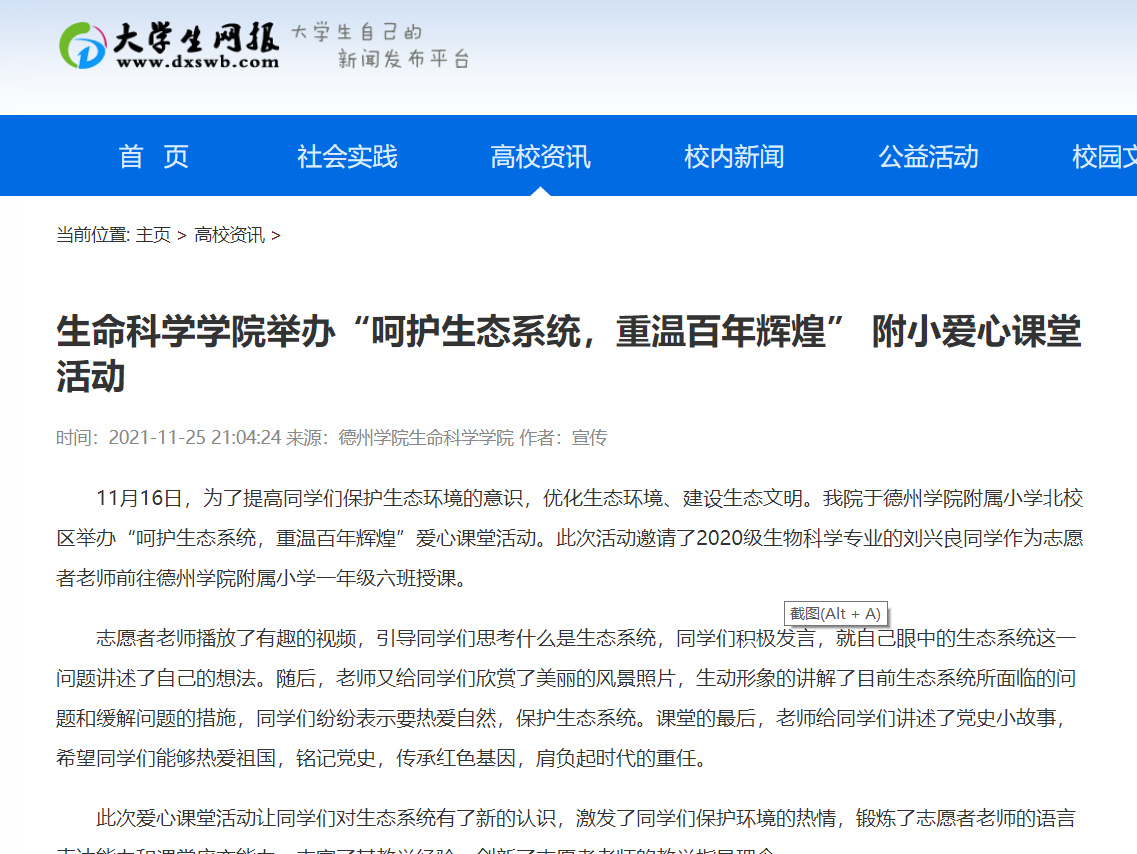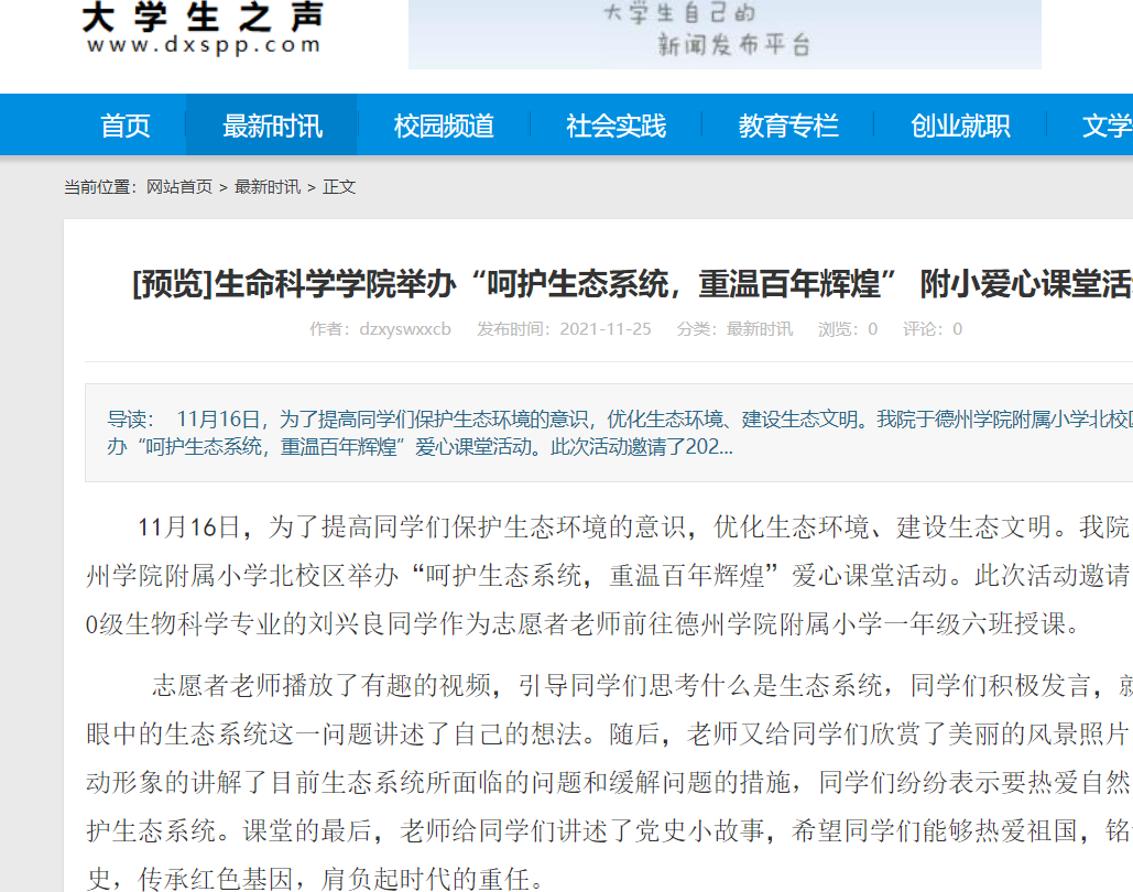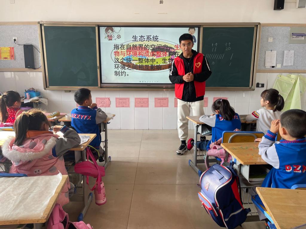 11月16日,为了提高同学们保护生态环境的意识,优化生态环境、建设生态文明。我院于ok138电子官方网站附属小学北校区举办“呵护生态系统,重温百年辉煌”爱心课堂活动。此次活动邀请了2020级生物科学专业的刘兴良同学作为志愿者老师前往ok138电子官方网站附属小学一年级六班授课。