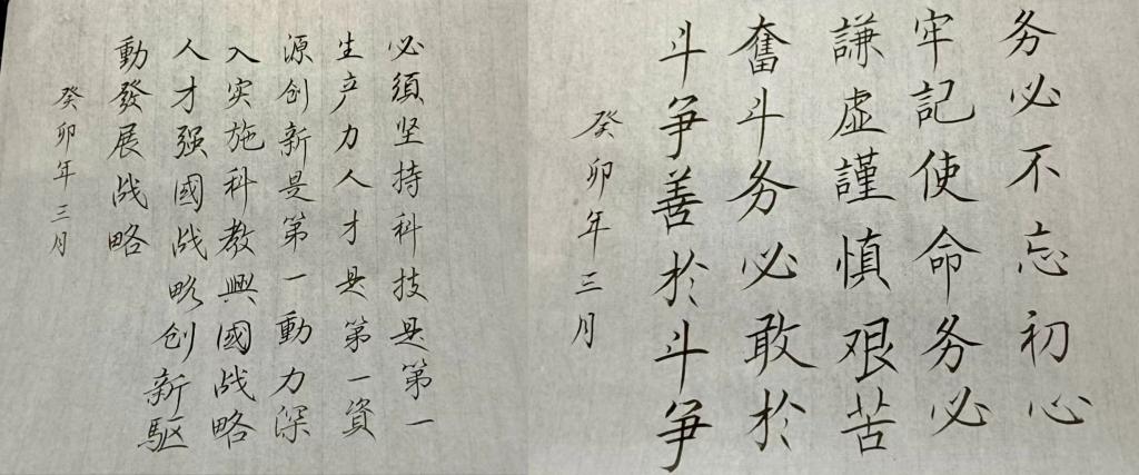 活动中,同学们学金句、读金句、悟金句,用饱蘸真情的笔墨,精湛的笔法,各具特色的书体,选取党的二十大报告中的金句,创作成书法作品,通过一撇一捺书写盛世芳华,一笔一划传达金句内涵,展现出新时代青年关心国家大事,在新征程中踔厉奋发,勇毅前行的决心。