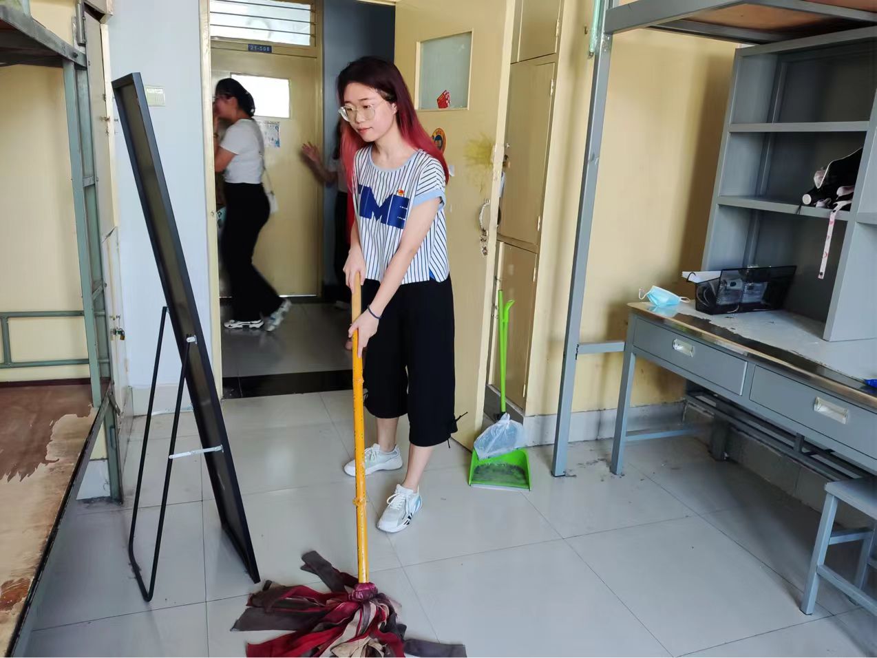 活动中,毕业生们分工合作、认真清扫,扫除地面角落的污垢、清除窗台上沉积的灰尘,对于寝室的桌椅、衣柜、床铺等寝室内部设施进行仔细清洁,使寝室焕然一新,同时将整理出的垃圾进行分类处理,将废弃物品带到宿舍楼外垃圾清理收集点,展现出我院毕业生良好的精神面貌。