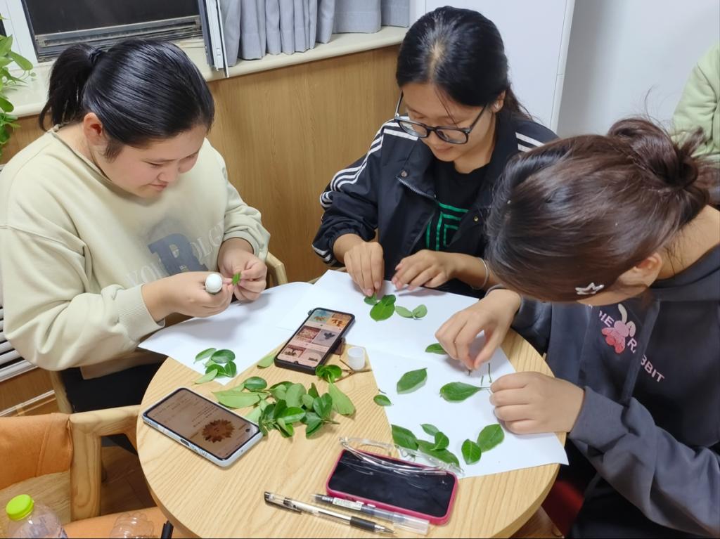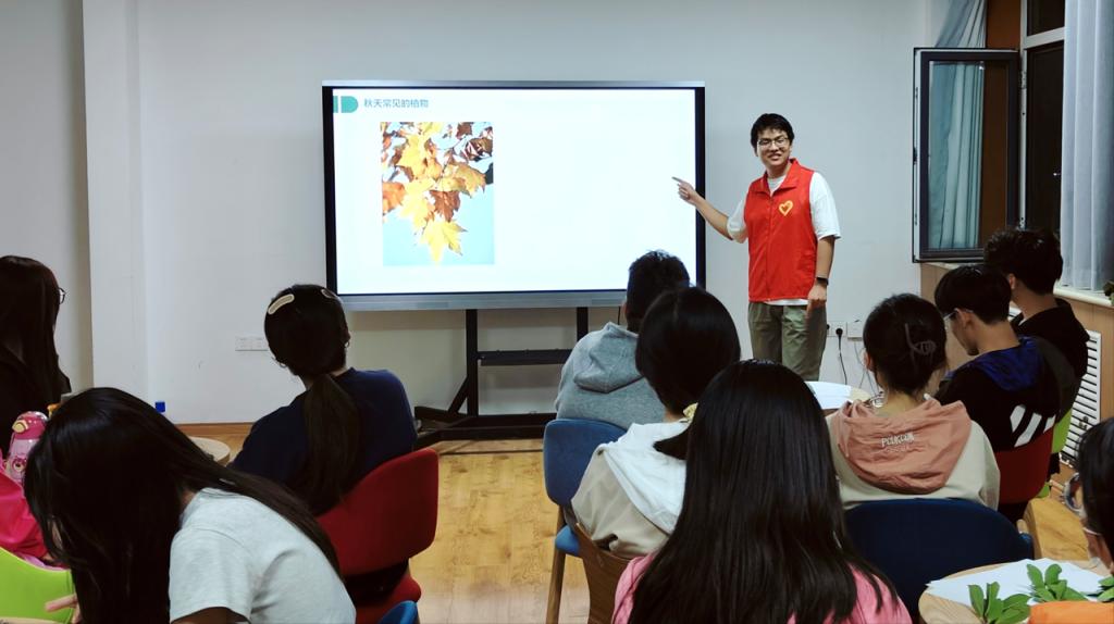 活动中,志愿者向同学们介绍了秋天常见的植物、不同树叶的形状,并讲解了树叶粘贴画的制作过程和注意事项。随后,志愿者们分发了树叶和工具,同学们利用收集的树叶进行二次创作,结合修剪、拼装、粘贴、添画等手法,描绘着自己眼中的秋日之景,创作出一幅幅充满趣味、栩栩如生的作品,让每一片树叶都充满着生命力。