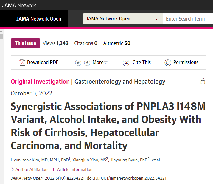 近日,一篇发表在国际杂志JAMA Network Open上的研究报告中,来自贝勒医学院等机构的科学家们发现,当结合饮酒和肥胖一起考虑时,名为PNPLA3的关键遗传突变风险因素或许在增加机体肝硬化、肝癌和肝脏相关死亡的风险上发挥着一定的协同作用。