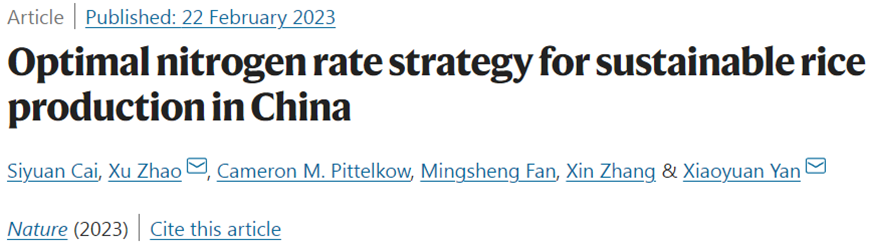 1. Siyuan Cai al. Optimal nitrogen rate strategy for sustainable rice production in China. Nature, 2023, doi:10.1038/s41586-022-05678-x.