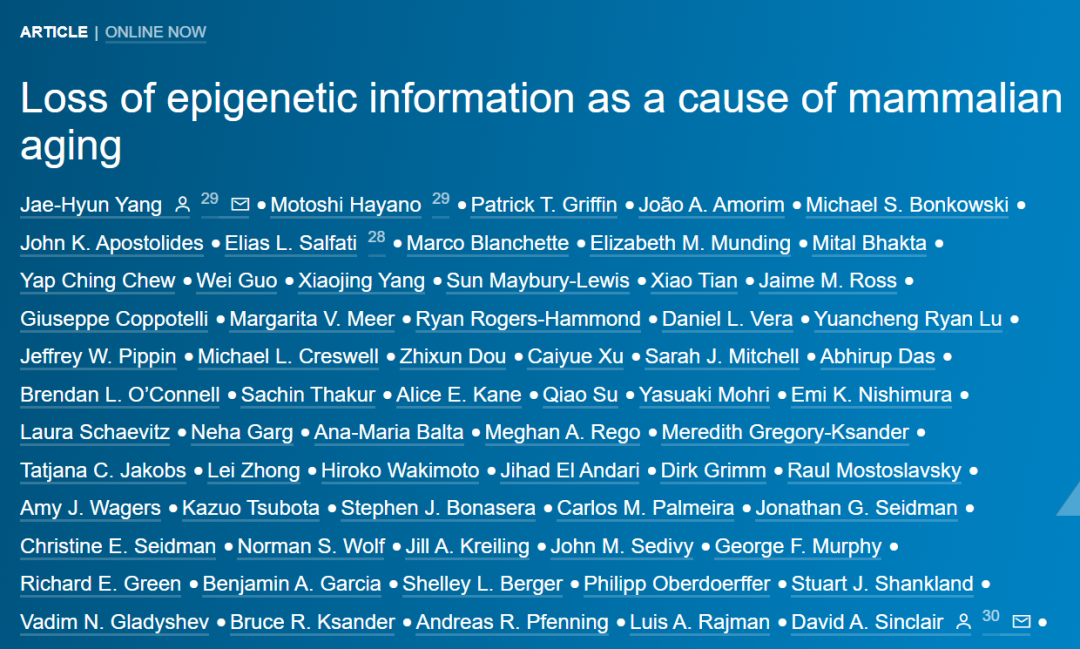 2023年1月12日,David Sinclair 实验室在国际顶尖学术期刊 Cell 上发表了题为:Loss of epigenetic information as a cause of mammalian aging 的研究论文。