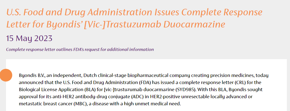 5月15日,Byondis宣布收到FDA就SYD985用于治疗HER2阳性乳腺癌的生物制品许可申请(BLA)发出的完整回复函(CRL)。FDA在CRL中表示,需要更多的信息来支持审批决定
