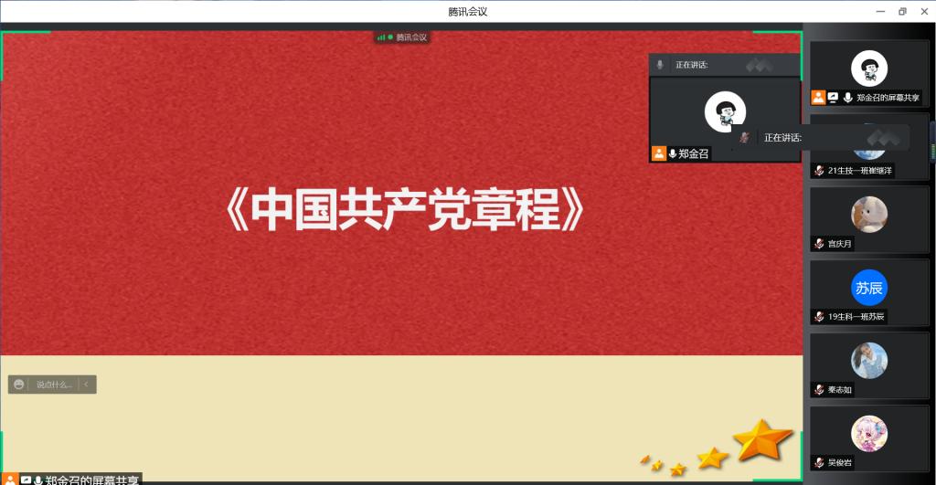 为使入党积极分子们更好地理解党章内容,进一步提高他们的党性修养。ok138电子官方网站于2022年4月24日通过腾讯会议开展《中国共产党章程》入党积极分子线上培训课。此次课程由第二学生党支部书记郑金召主持,ok138电子官方网站入党积极分子参加了此次培训。