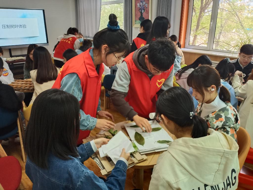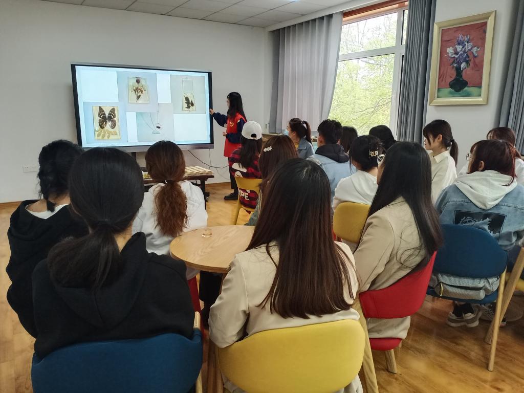 活动过程中,主讲人王美仪用精心制作的课件,向同学们介绍了琥珀的形成过程,琥珀是植物分泌出的稠状或凝胶状的液体,经过长时间深埋及挥发成分后形成的树脂类化石,以此进一步加深了同学们对琥珀的了解。此外,主讲人还向同学们展示了植物琥珀和动物琥珀的制作流程及制作方法。主讲人在讲解制作流程时,向大家分发了植物和动物琥珀的制成品,让同学们近距离的观赏琥珀艺术工艺品,帮助他们更好的了解琥珀的制作过程。主讲人还向同学们讲解了叶脉书签的制作流程,分别是采集树叶、压干树叶、构思、制作四个步骤,并为同学们亲手演示了压制树叶的流程。同学们按照压制树叶的流程并在主讲人的指导下完成了树叶的压制。最后主讲人为同学们系统的梳理了如何制作琥珀、如何压制标本,同学们纷纷表示本次琥珀制作活动具有很强的指导性、针对性和启发性,让同学们受益匪浅。