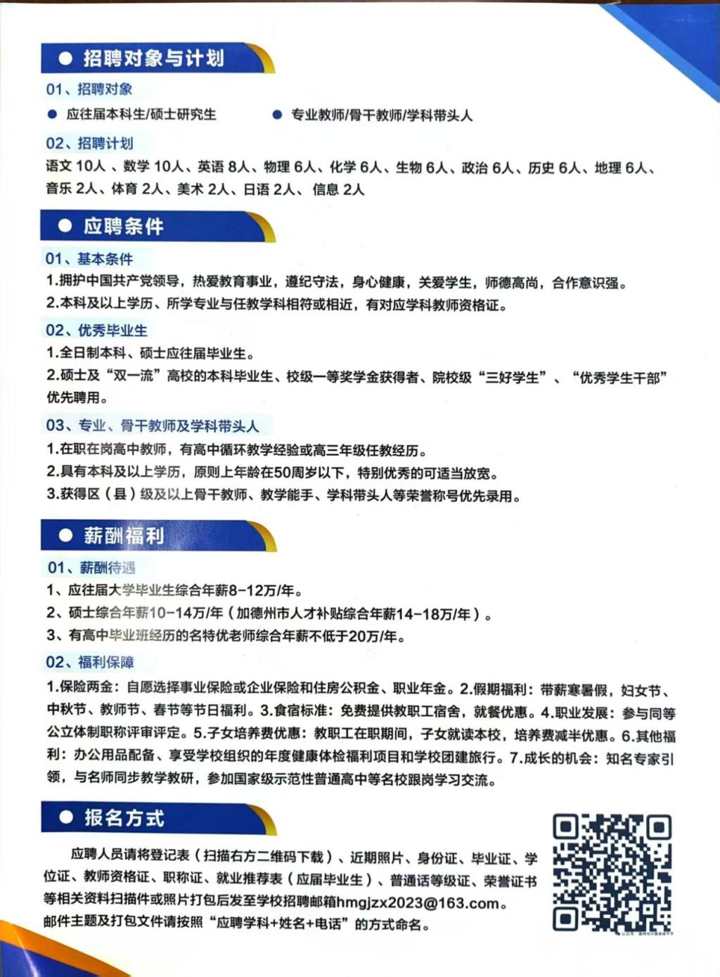 1.招聘岗位:语文10人、数学10人、英语8人、物理6人、化学6人、生物6人、政治6人、历史6人、地理6人、音乐2人、体育2人、美术2人、日语2人、信息2人